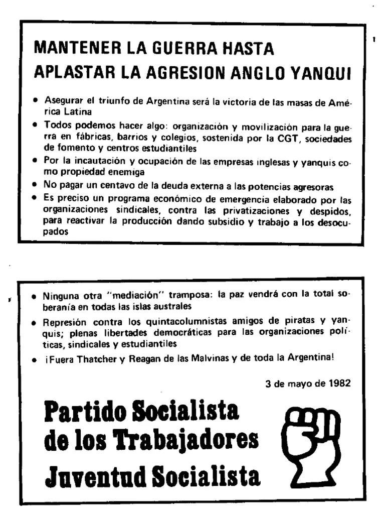 Por eso el PST proponía hacer exactamente lo contrario. Había que hacer que pagaran el costo de la guerra los imperialistas, no pagando un solo peso de la deuda externa e incautando todos los bienes de propiedad inglesa (Banco de Londres, la British Petroleum, las estancias inglesas, la Shell, etc.) 2. Y como era explícito el apoyo del imperialismo norteamericano a la intervención británica también se debía tomar las mismas medidas con las empresas norteamericanas y con las empresas de capital extranjero de aquellos países que hubieran sancionado a la Argentina.